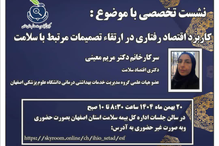 به گزارش روابط عمومی مرکز، نشست تخصصی با عنوان" کاربرد اقتصاد رفتاری در ارتقا تصمیمات مرتبط با سلامت ،با مشارکت مرکز تحقیقات عوامل اجتماعی موثر بر سلامت دانشگاه علوم پزشکی اصفهان، و اداره کل بیمه سلامت استان اصفهان، در تاریخ ۲۰ بهمن ۱۴۰۴ برگزار شد.