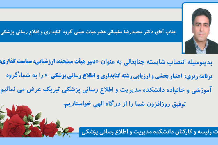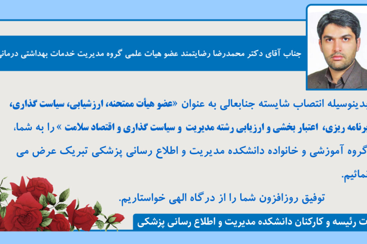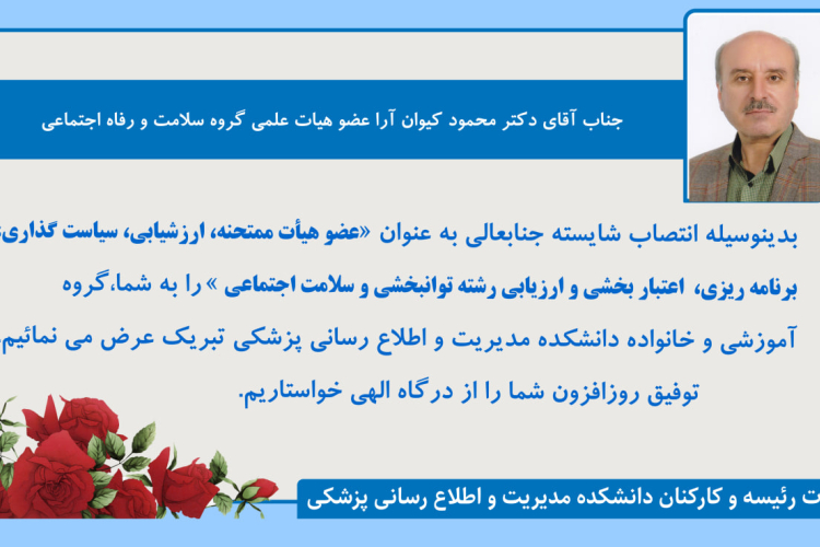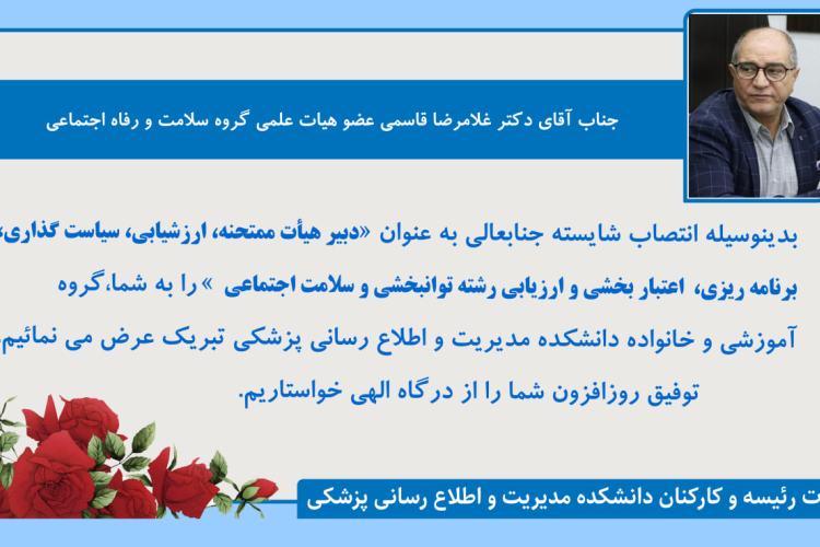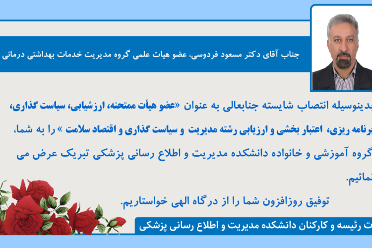 بدینوسیله عضویت جمعی از اساتید گرانقدر دانشکده مدیریت و اطلاع رسانی پزشکی به عنوان هیات های ممتحنه،ارزشیابی،سیاست گذاری،برنامه ریزی،اعتبار بخشی و ارزیابی گروهای مختلف در وزارت بهداشت، را تبریک عرض کرده و برای ایشان موفقیت و توفیق روز افزون آرزومندیم.